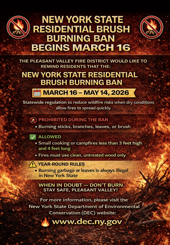 The annual statewide ban prohibiting residential brush burning begins tomorrow, March 16 and runs through Thursday, May 14. Since 2009, the NYS Department of Environmental Conservation has enforced the annual brush burning ban to prevent wildfires and protect communities as the weather starts to warm, which can quickly cause wildfire conditions to arise. Open burning of debris is the single-largest cause of spring wildfires in New York State.